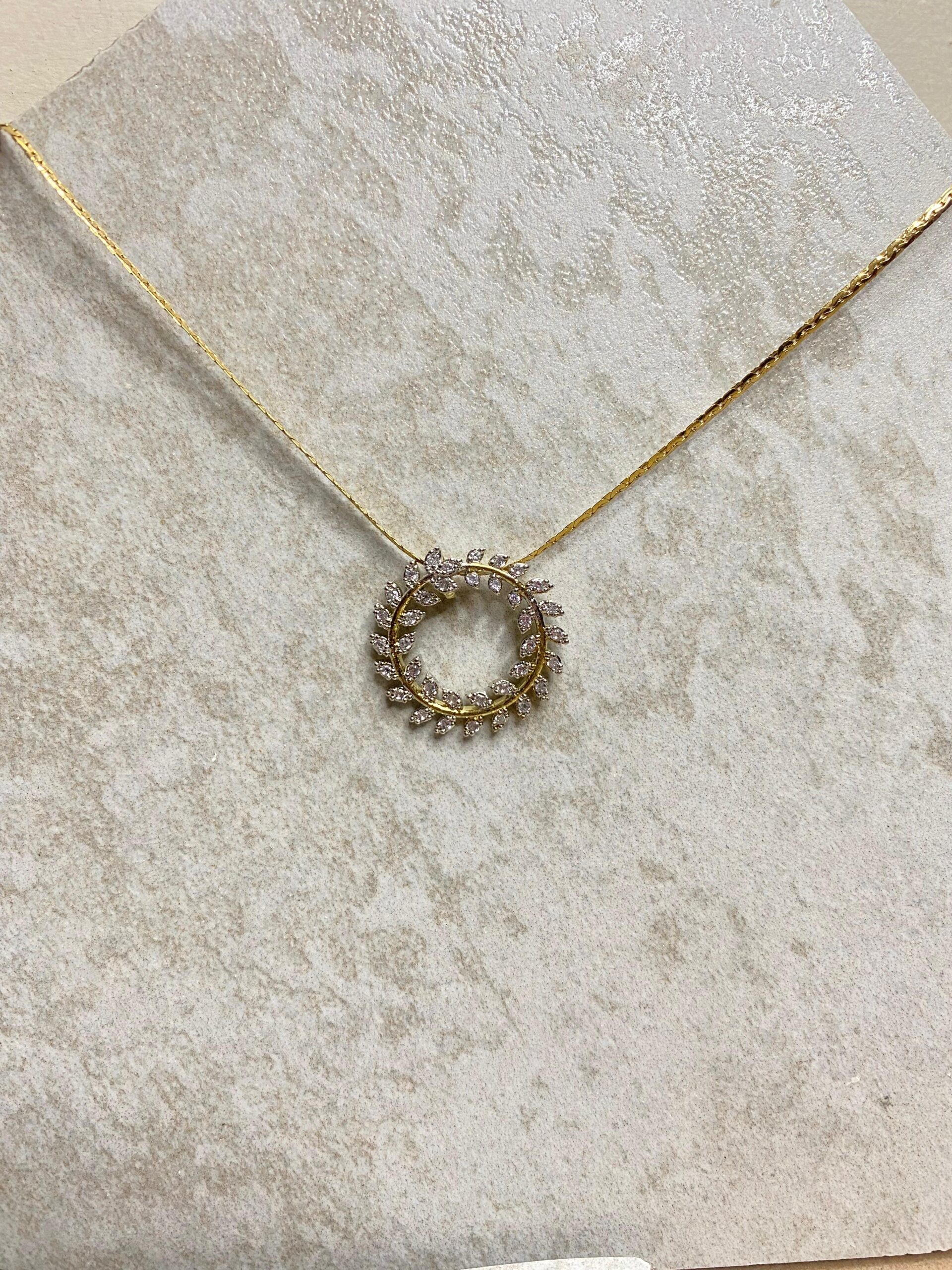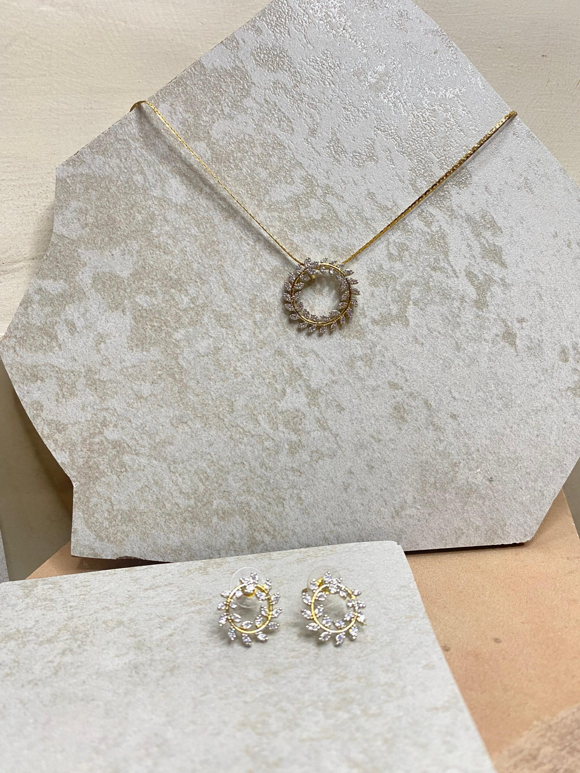 This set looks really elegant and classy. The circular design with the small sparkling stones gives it a very delicate and timeless look. The pendant and earrings match perfectly and shine beautifully, especially against Indian outfits. Lovely piece for daily wear or small functions very graceful and feminine.