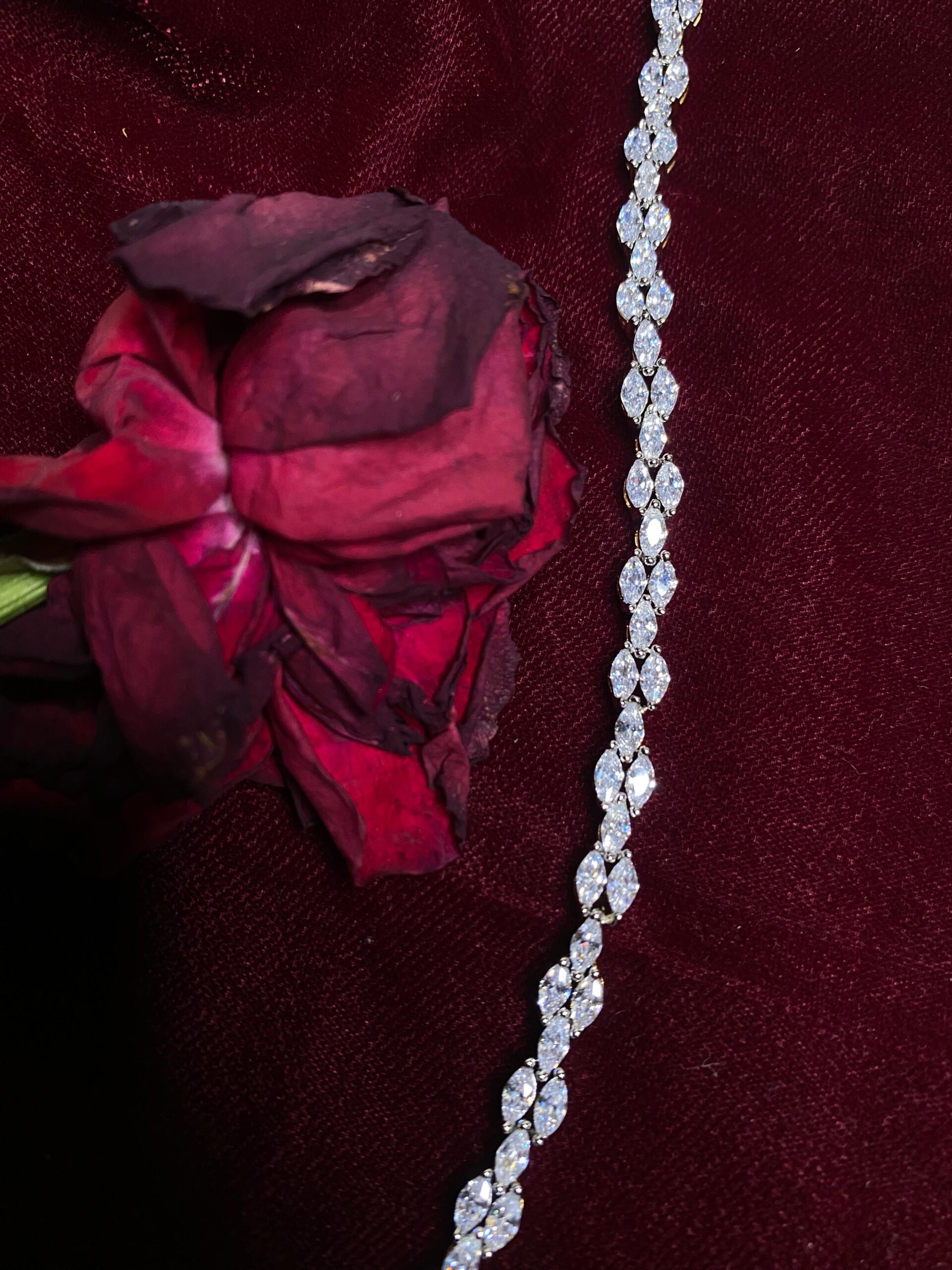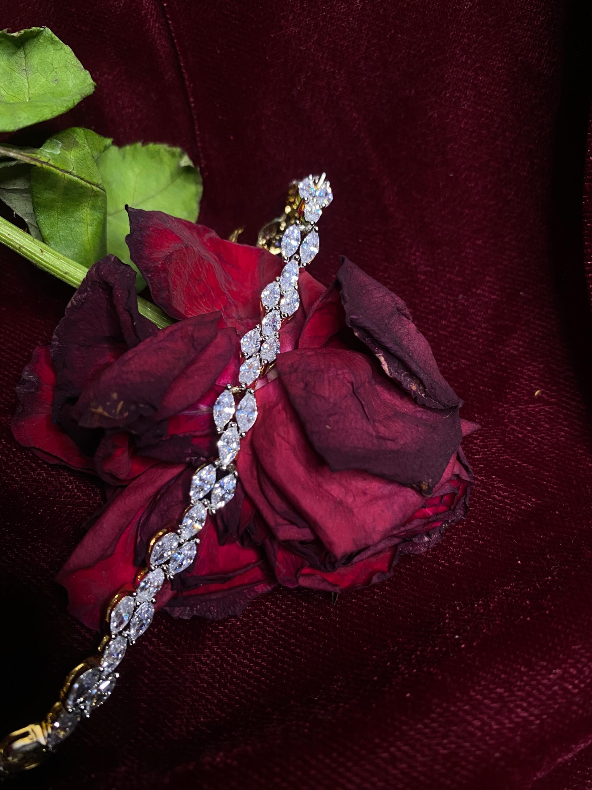 Inspired by nature’s elegance, the Leaflet Bracelet features marquise-cut American diamonds gracefully arranged like delicate leaves. Its golden base adds a hint of luxury, making it a perfect blend of sophistication and sparkle for every occasion.