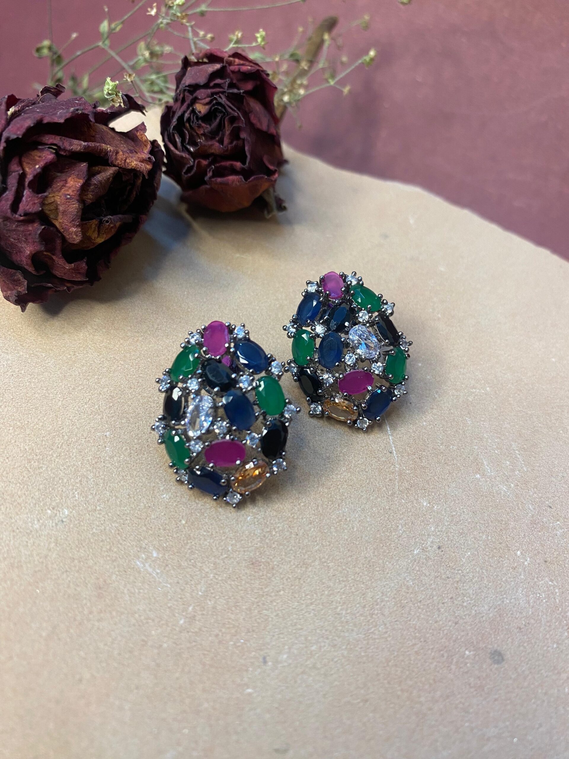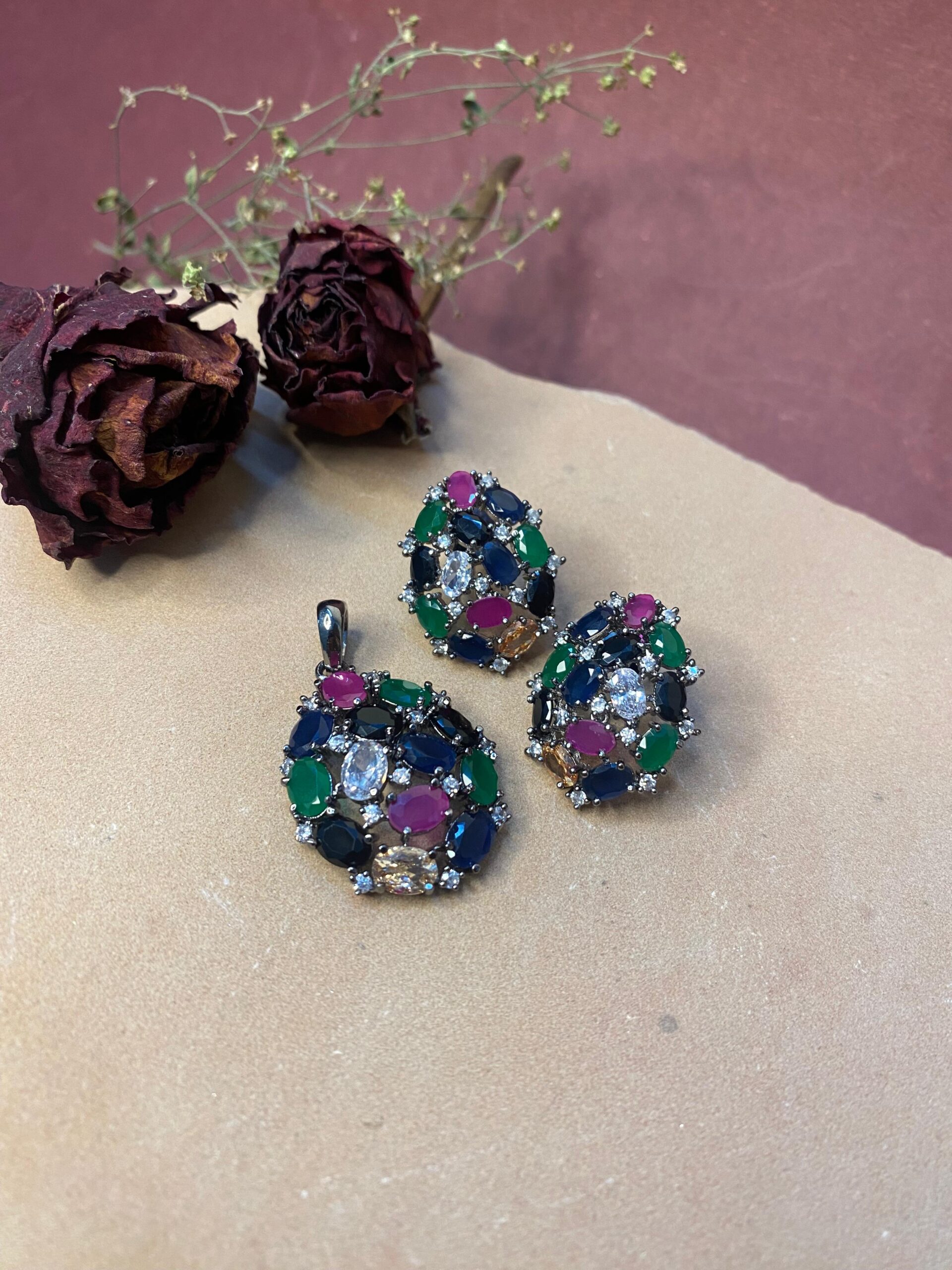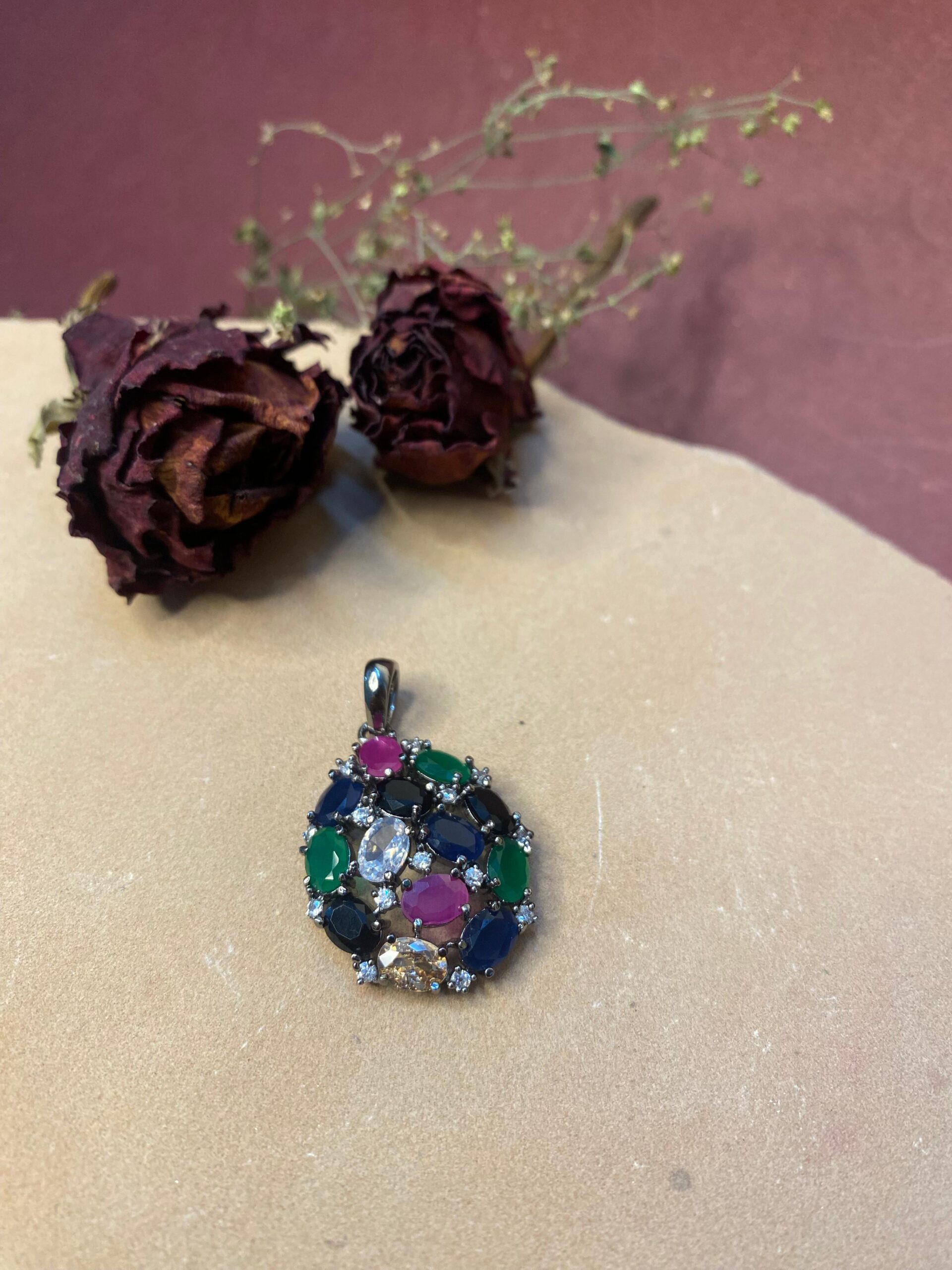 - Multicolor (Deep navy blue, emerald green, ruby red, golden yellow, white, and more) on a silver-tone base