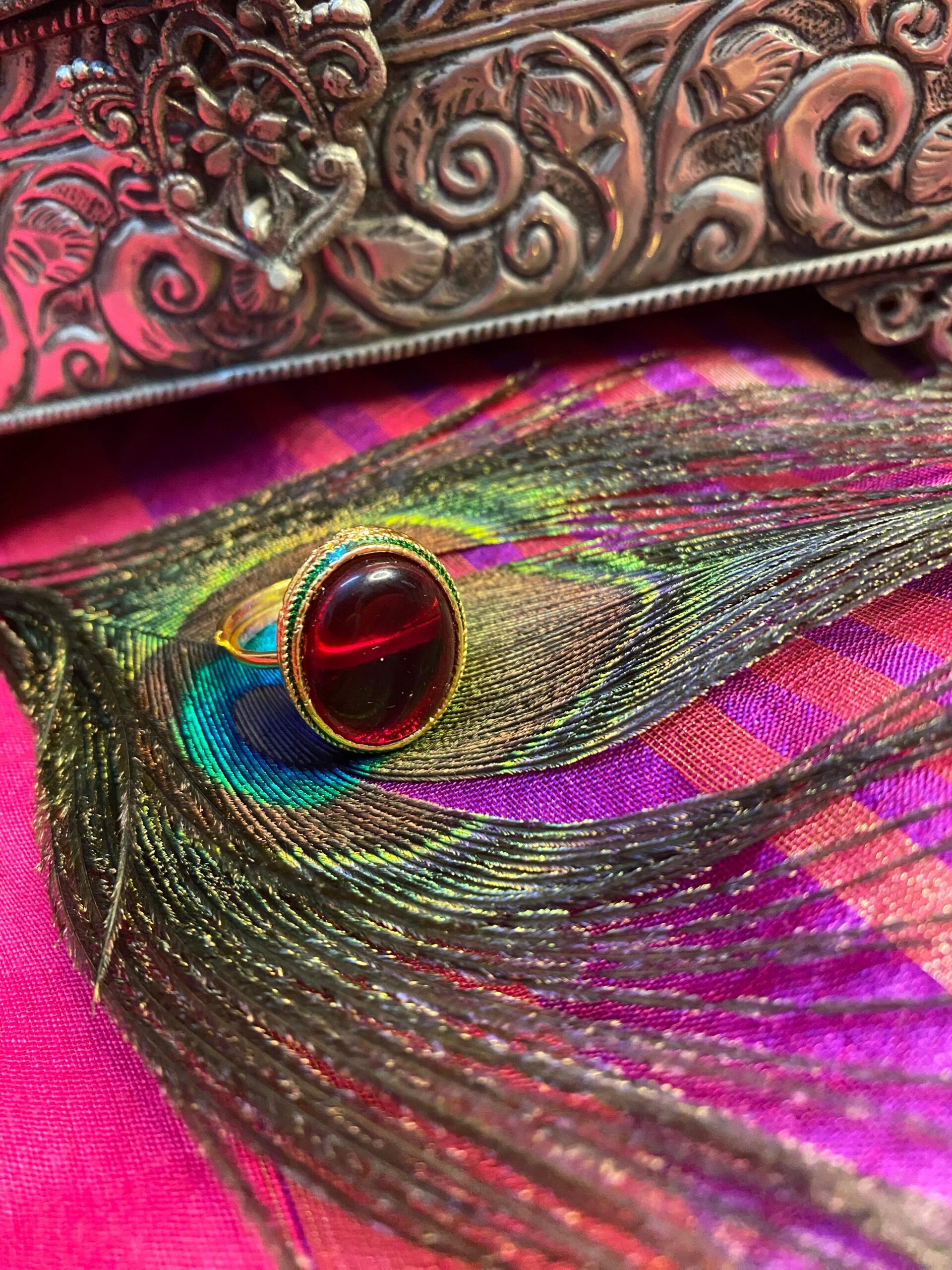 - Ring Color: Deep Red Stone with Antique Gold Band