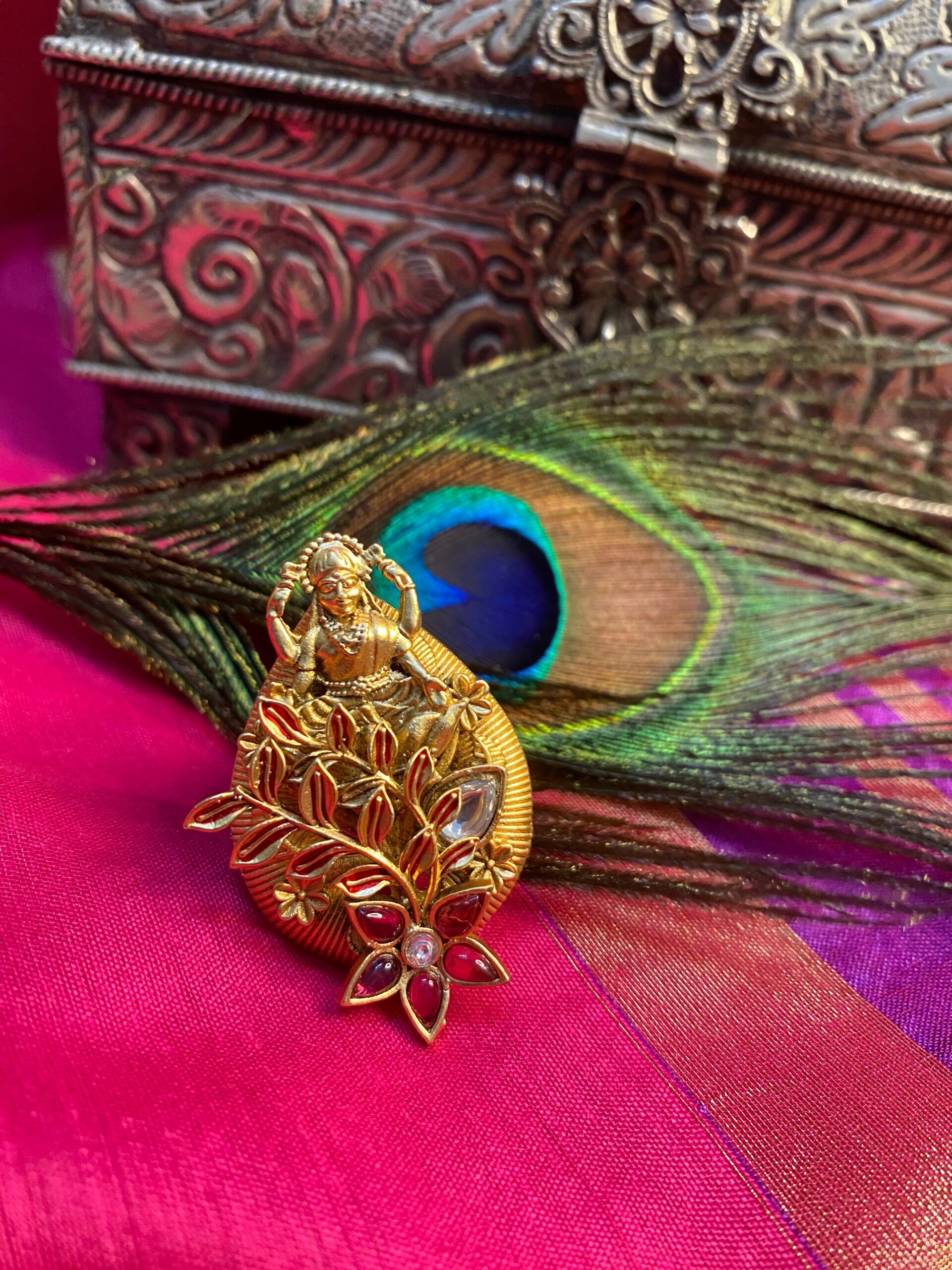Celebrate devotion and tradition with the Shri Laxmi Ring, featuring an intricately carved Laxmi motif, floral detailing, and vibrant red kundan stones. A perfect blend of spirituality and elegance.