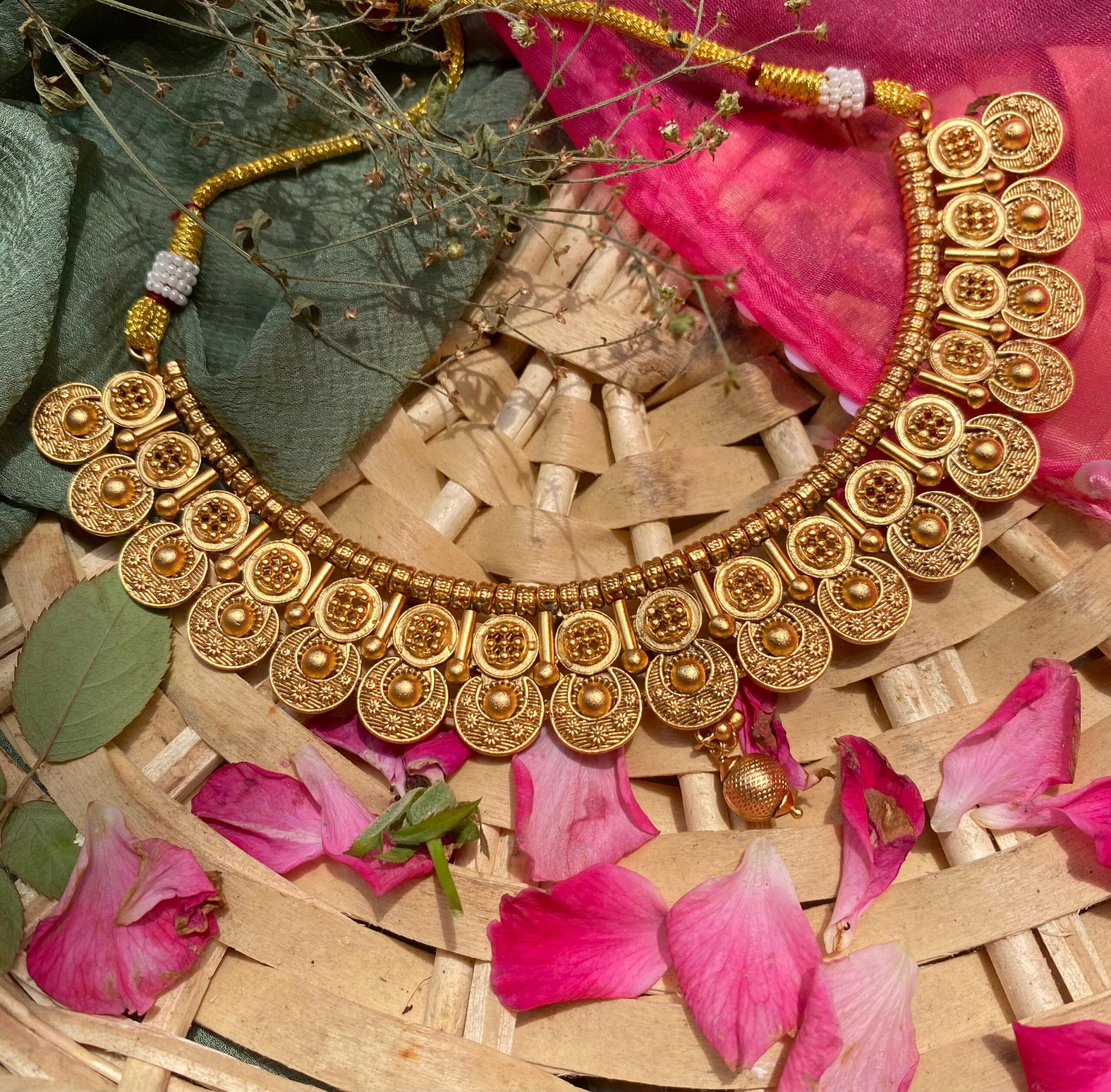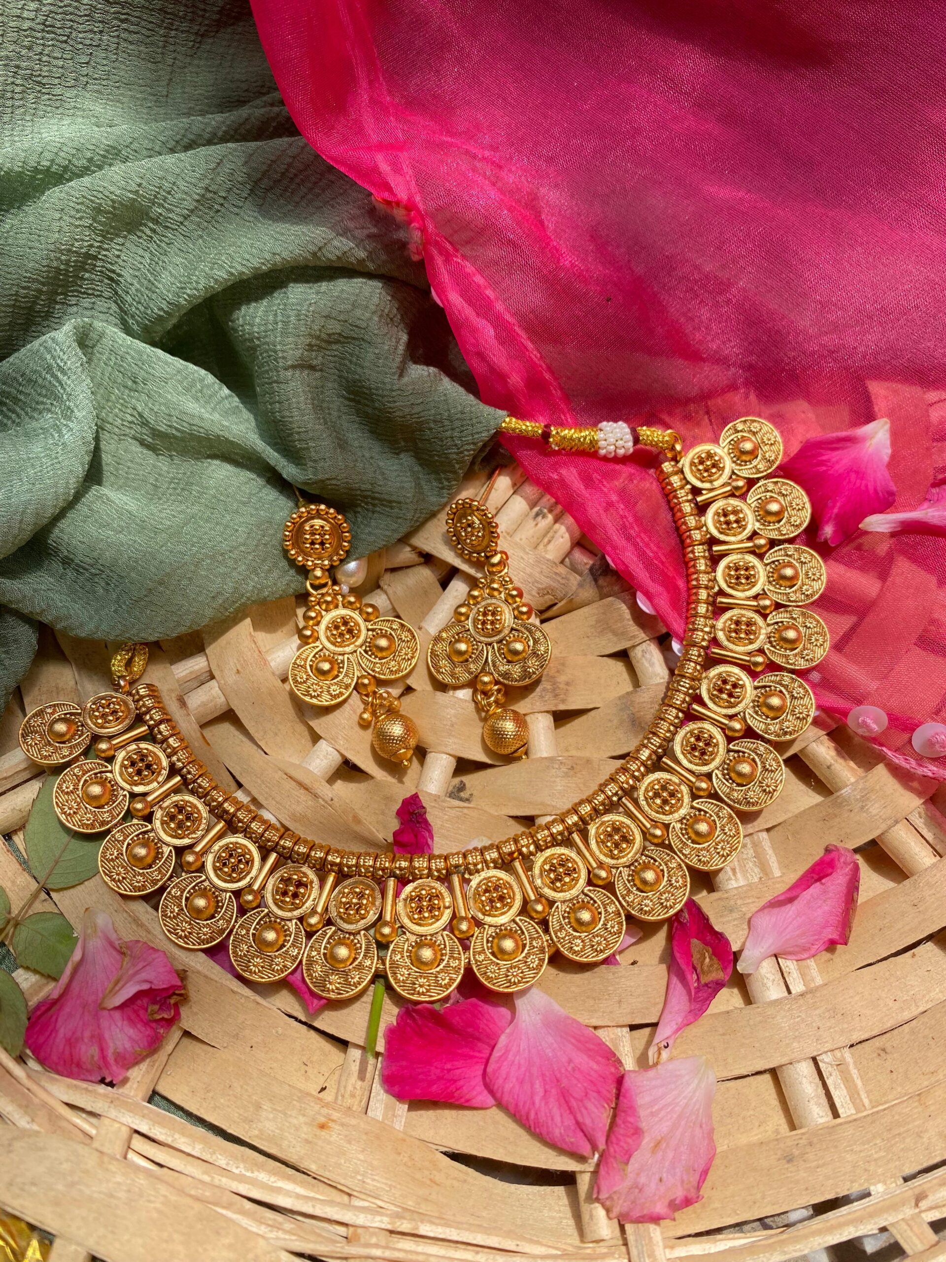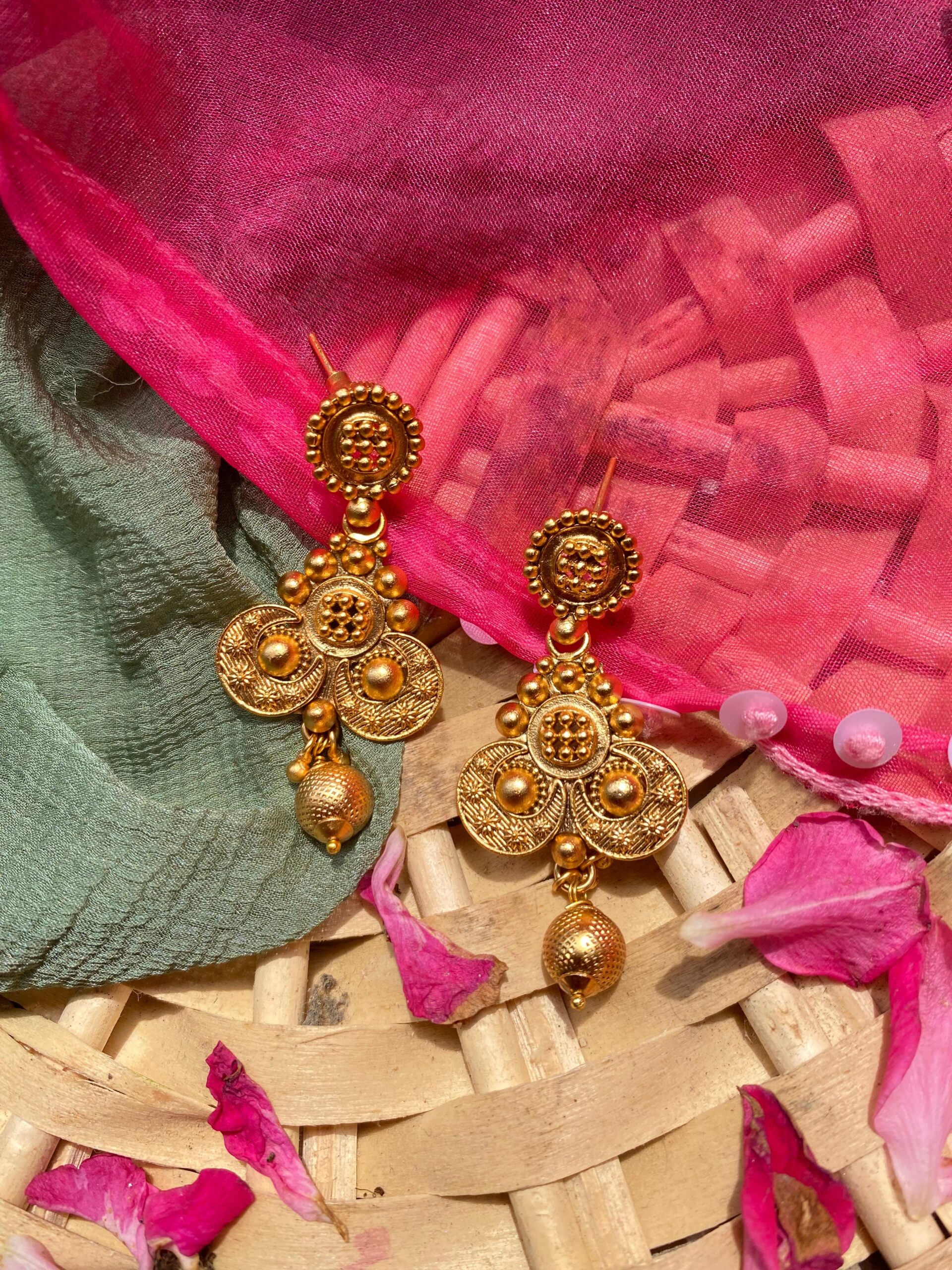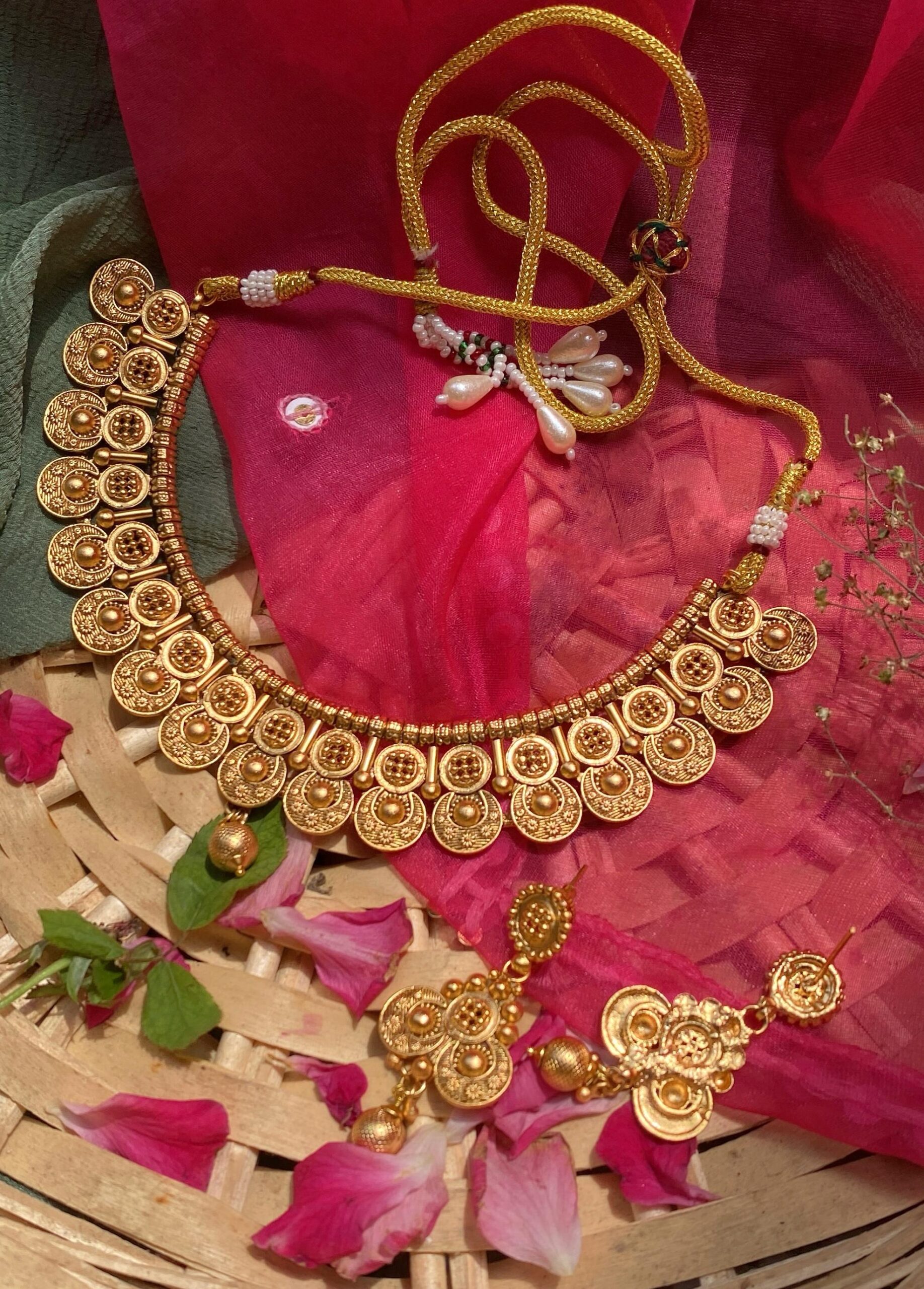 Design: Semi-circular layered coin motifs with intricate embossing and floral engravings, inspired by traditional temple and coin jewelry.